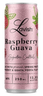 Lavish Raspberry Guava is een licht koolzuurhoudende cocktail met vodka smaak. Gemaakt met premium bronwater, en heeft een zoete en verfrissende framboos en guave vodka smaak. Lavish Raspberry Guava bevat 12,5% alcohol en is verpakt in een mat, kleurrijk blikje van 250 ml.